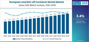 ROCKVILLE, MD, UNITED STATES, November 11, 2025 /EINPresswire.com/ -- The global dumpster and roll-off container rental market is poised for steady growth over the next decade, driven by increasing demand for specialized waste management solutions and expanding construction and industrial activities. According to FactMR, the market is valued at USD 7.2 billion in 2025 and is projected to reach USD 10.1 billion by 2035, registering a compound annual growth rate (CAGR) of 3.4%.The report, “Dumpster and Roll-off Container Rental Market Size, Share, and Forecast 2025–2035,” highlights that roll-off containers will dominate the market with a 60% share, while construction applications lead with 40% of the market.