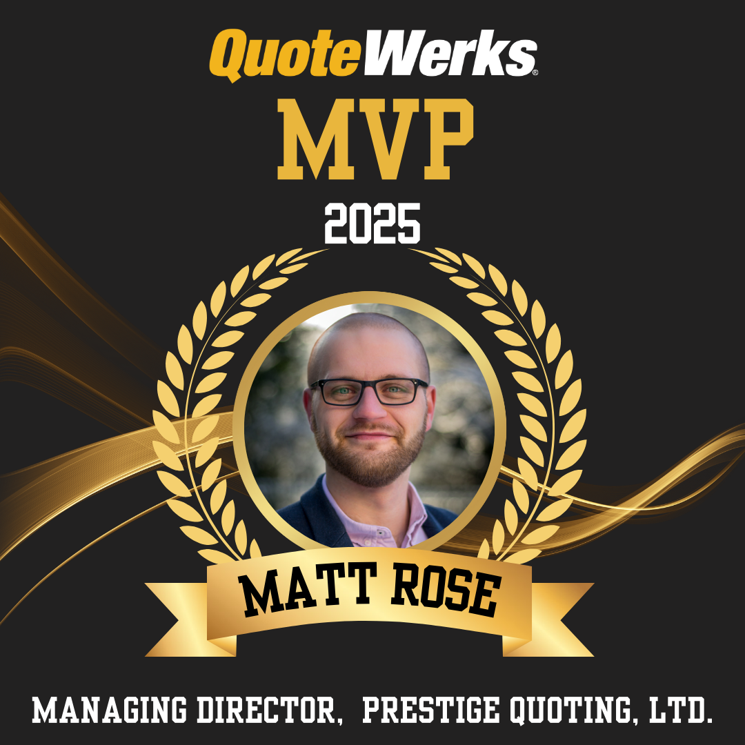 The 2025 QuoteWerks MVP Award, selected by both the community and QuoteWerks staff, was presented to Matt Rose of Prestige Quoting Ltd. This honor recognizes an individual who has consistently contributed time, expertise, and support to help users succeed.